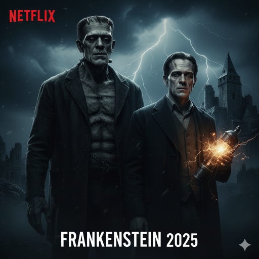 Frankenstein(2025) — 감독 Guillermo del Toro가 Frankenstein; or, The Modern Prometheus(1818) (Mary Shelley 저작)를 바탕으로 제작한 영화로, Netflix에서 공개되었습니다.
